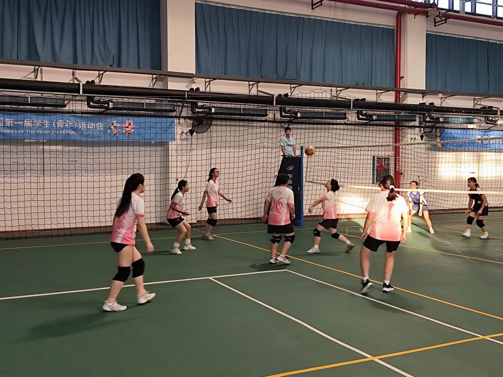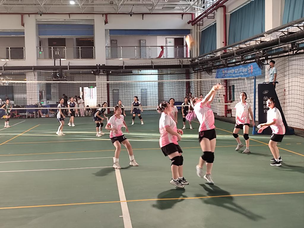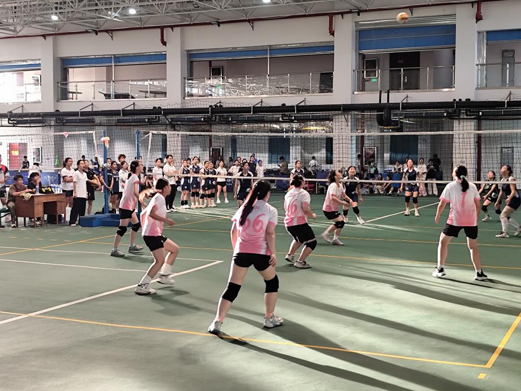 赛前,我院队员早早热身,状态饱满。哨声响起,比赛正式开始。教科院队凭借强势发球与连贯扣杀占据先机,我院队员虽处被动,却始终咬牙坚持。她们默契配合,奋力防守,每一次有效救球都赢得观众阵阵欢呼。